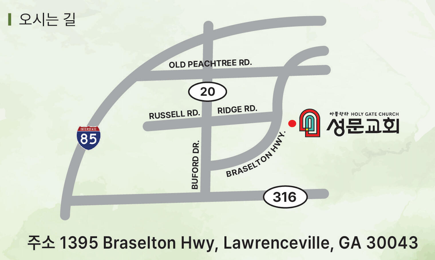 아틀란타 성문교회에 방문하신 성도님들을 예수 그리스도의 이름으로 환영합니다.